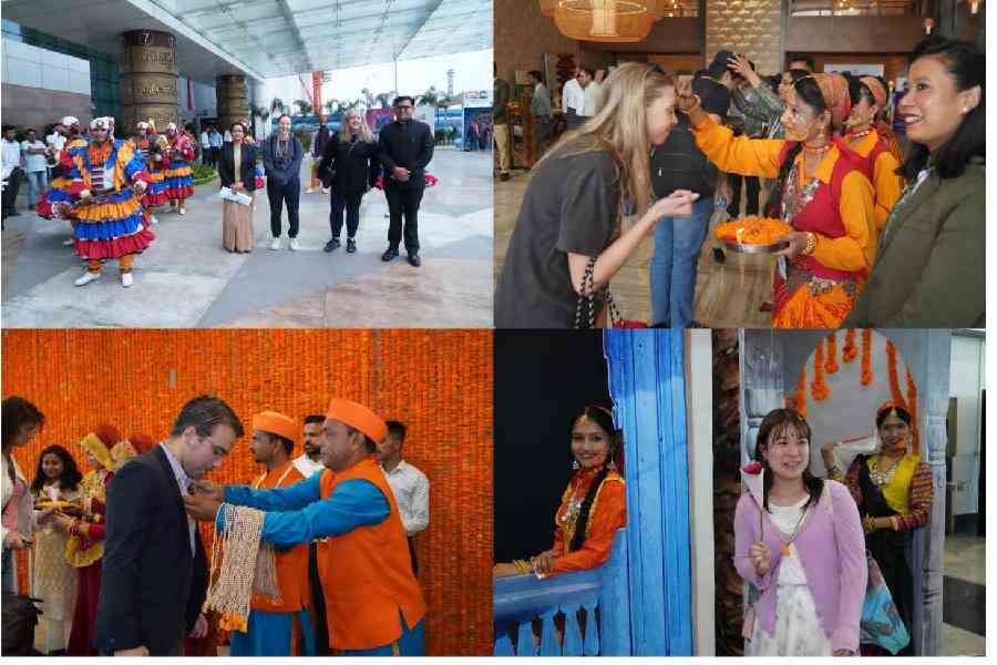जी 20 सम्मेलन में प्रतिभाग करने पहुंचे प्रतिनिधिमंडल/मेहमानों का जौलीग्रांट एयरपोर्ट पर तिलक, पुष्प वर्षा एवं तुलसी की माला पहना कर लोक संस्कृति से  स्वागत अभिनंदन किया। राज्य की लोक संस्कृति एवं जीवन शैली से रूबरू होते हुए, प्रतिनिधि मंडल/मेहमानों एयरपोर्ट परिसर में राज्य की स्थानीय लोक संस्कृति कार्यक्रम का लुत्फ़ उठाते हुए नृत्य में शामिल हुए/ तस्वीर खिचवाई।