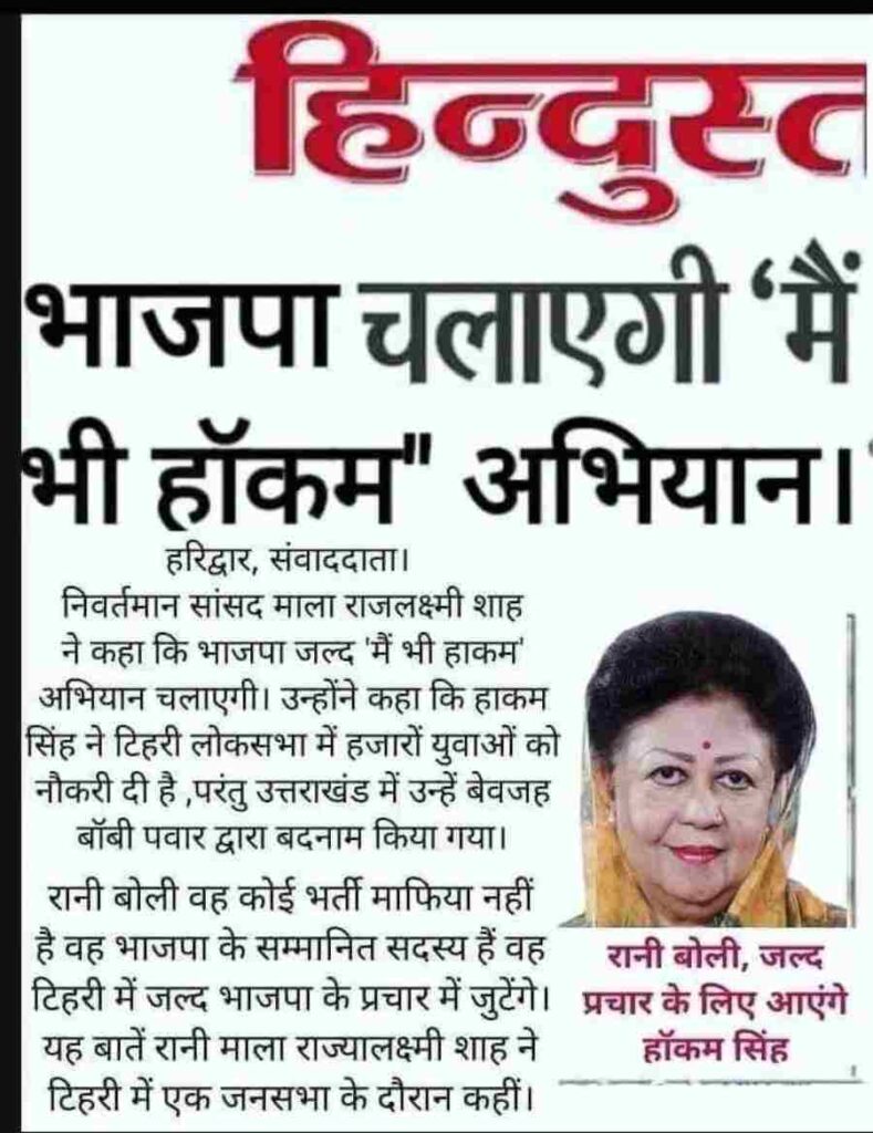 दिनांक 02-04-2024 को लोकसभा प्रत्याशी, टिहरी श्रीमती माला राज्य लक्ष्मी शाह द्वारा थाना कोतवाली नगर पर दी गई लिखित तहरीर, जिसमें अज्ञात व्यक्तियो द्वारा फर्जी कथन/पेपर कटिंग तैयार कर उसे सोशल मीडिया पर वायरल करते हुए उनकी छवि धूमिल करने तथा उक्त पेपर कटिंग के सम्बंध में सम्बन्धित राष्ट्रीय दैनिक समाचार पत्र से जानकारी करने पर उनके द्वारा ऐसी किसी खबर को प्रकाशित न होना अवगत कराने, के आधार पर थाना कोतवाली नगर पर मु0अ0सं0-161/24, धारा 469, 501 भादवि बनाम अज्ञात पंजीकृत किया गया।