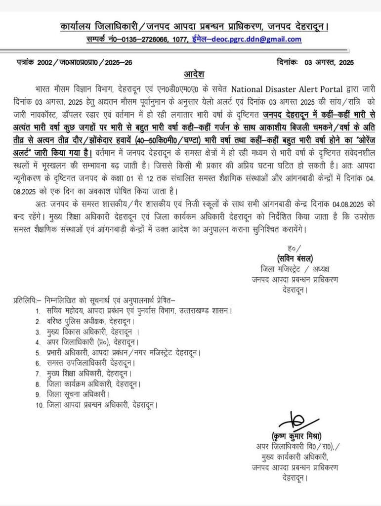 मौसम विभाग की चेतावनी के मद्देनजर प्रदेश के चार जनपदों में स्कूलों की छुट्टी घोषित, देहरादून, बागेश्वर, चंपावत और नैनीताल में कक्षा एक से 12वीं तक के स्कूल आज रहेंगे बंद