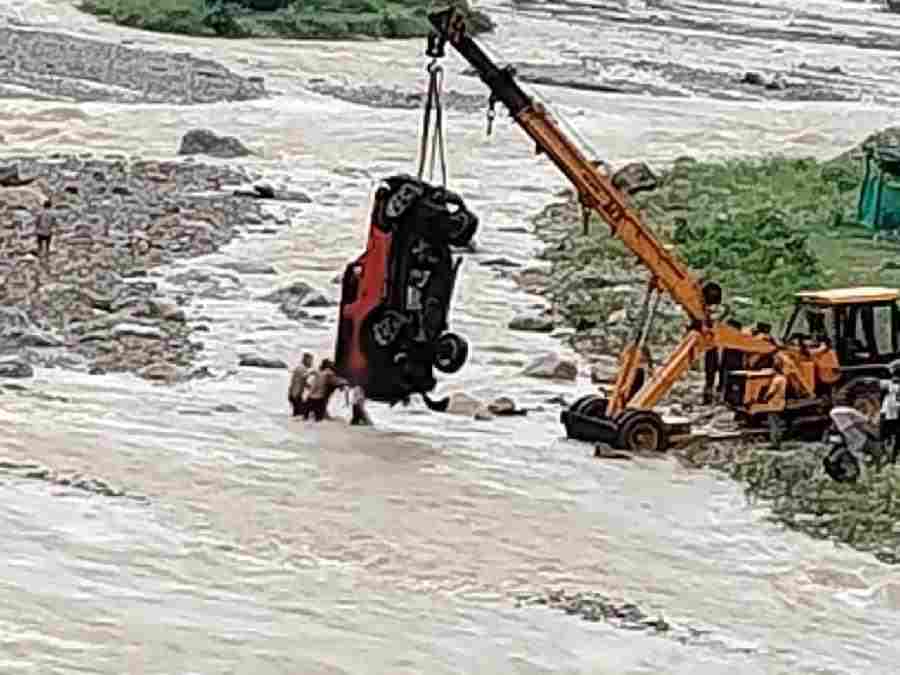 नदी के तेज बहाव के बीच फंसी थार कार को पुलिस ने JCB व क्रेन की सहायता से बाहर निकाल कर किया उसके मालिक के सुपुर्द