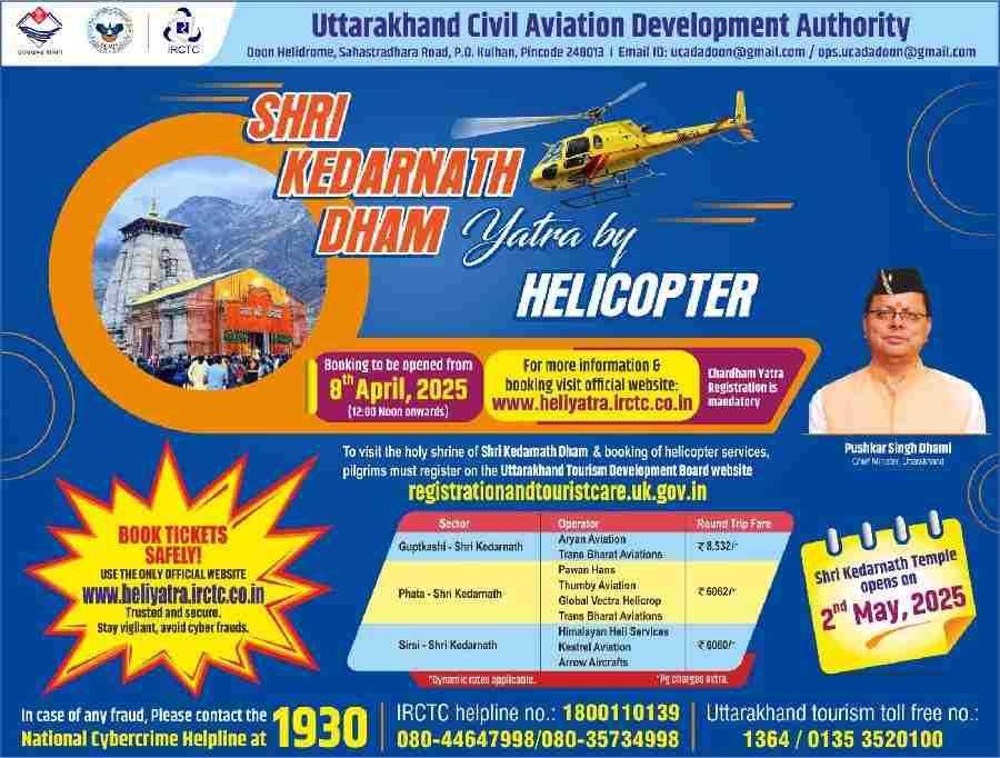 चारधाम यात्रा के शुभ अवसर पर देशभर से हजारों श्रद्धालु श्री केदारनाथ धाम दर्शन हेतु हेलीकॉप्टर सेवा के लिए ऑनलाइन टिकट बुकिंग करते हैं। दुर्भाग्यवश, साइबर अपराधी इस धार्मिक आस्था का दुरुपयोग कर फर्जी वेबसाइटों, सोशल मीडिया पेजों एवं विज्ञापनों के माध्यम से ठगी का प्रयास करते हैं। इस पर *प्रभावी रोकथाम हेतु मुख्यमंत्री उत्तराखण्ड पुष्कर सिंह धामी के निर्देशानुसार एवं पुलिस महानिदेशक उत्तराखण्ड दीपम सेठ के मार्गदर्शन में स्पेशल टास्क फोर्स (एसटीएफ) द्वारा लगातार कार्रवाई की जा रही है।*